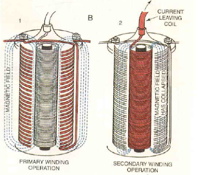 Ignition coil operation. 1-primary winding. 2- Secondary